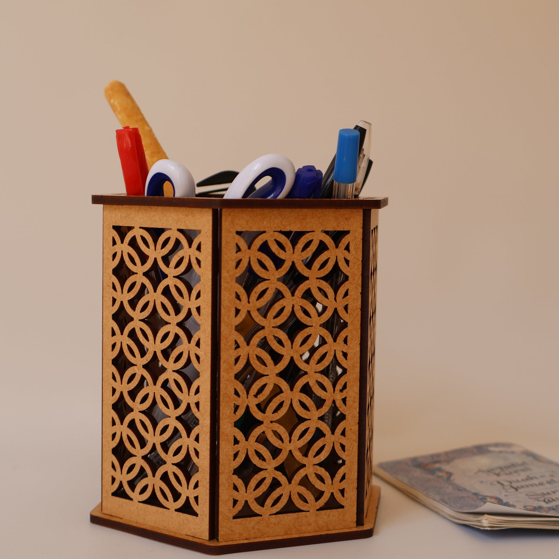 Elevate your space with this intricately crafted hexagonal container, designed to blend spiritual elegance with modern utility. Each panel features precision laser-cut geometric patterns inspired by interlocking circular motifs—symbolizing unity, harmony, and divine balance.
