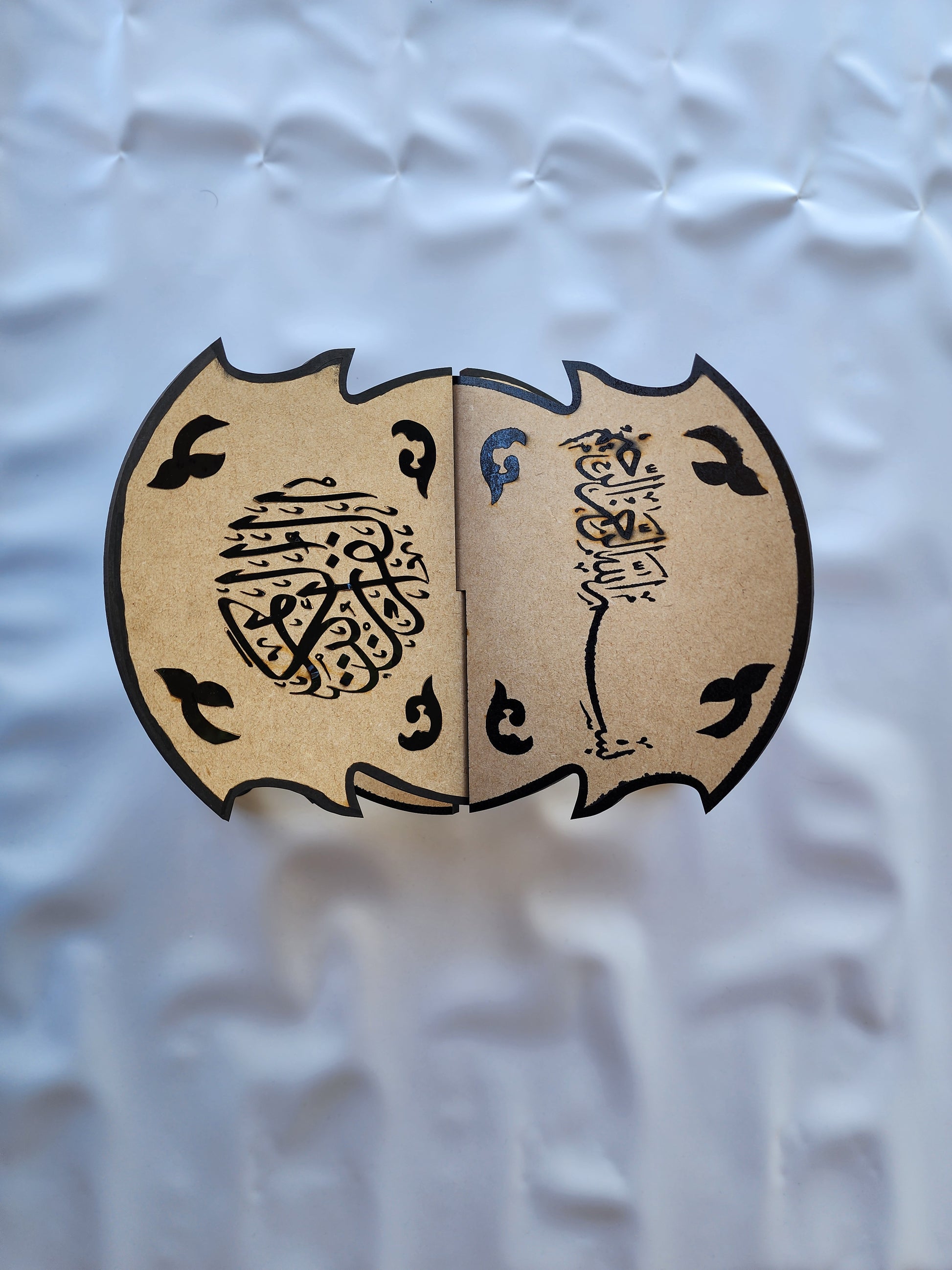 Adorned with the revered phrase بِسْمِ ٱللّٰهِ ٱلرَّحْمَـٰنِ ٱلرَّحِيمِ (In the name of Allah, the Most Gracious, the Most Merciful) and the elegant inscription القرآن (Al-Qur’an), each stroke is a tribute to divine beauty. The contrast of rich wood tones and graceful Arabic script adds depth and sophistication to any prayer space.