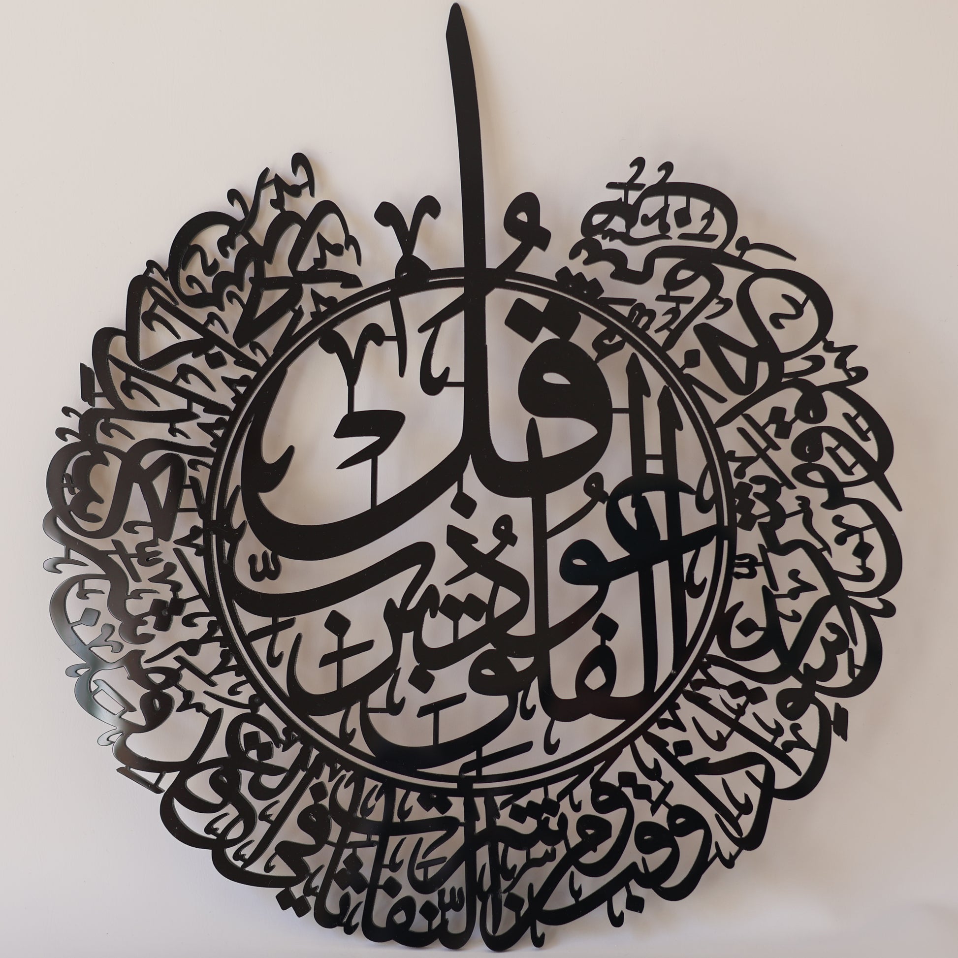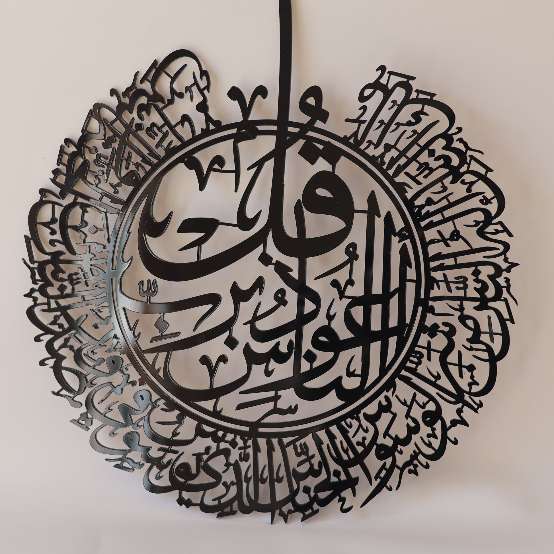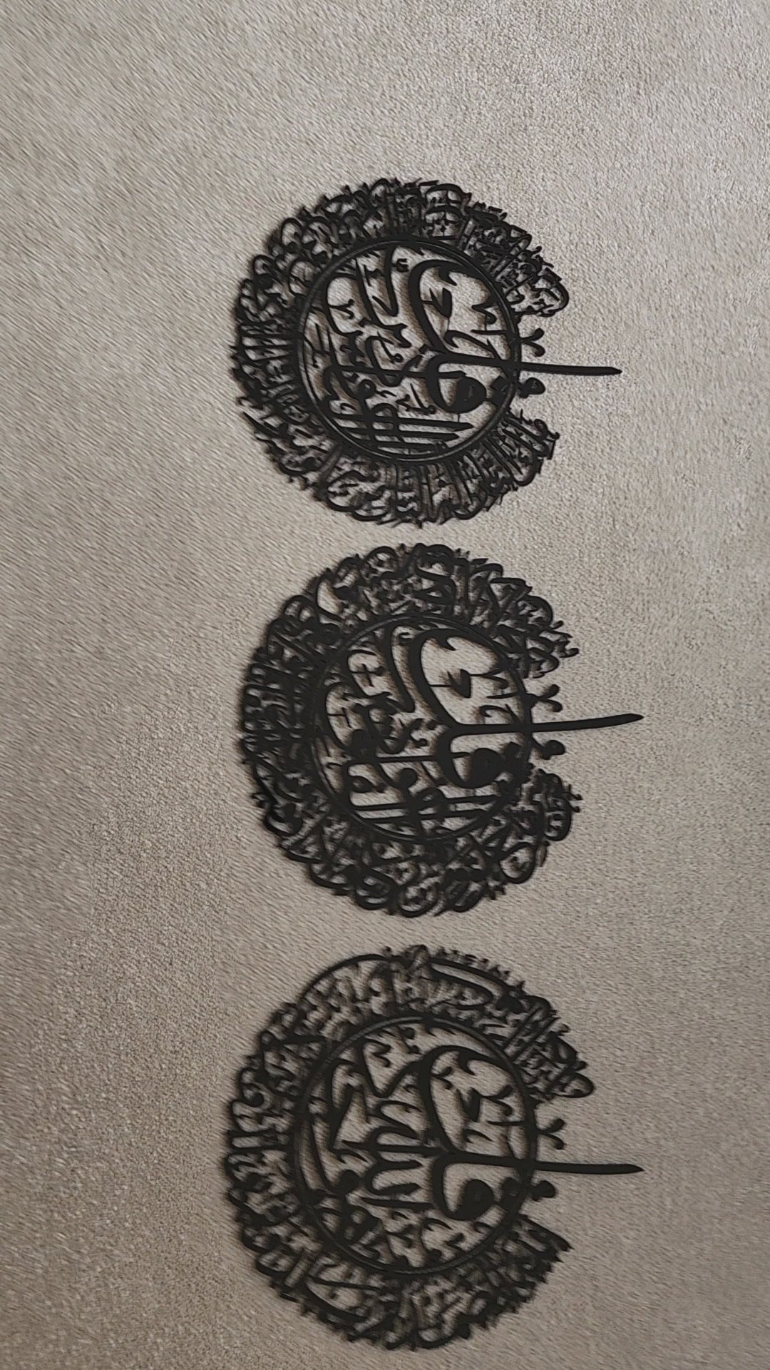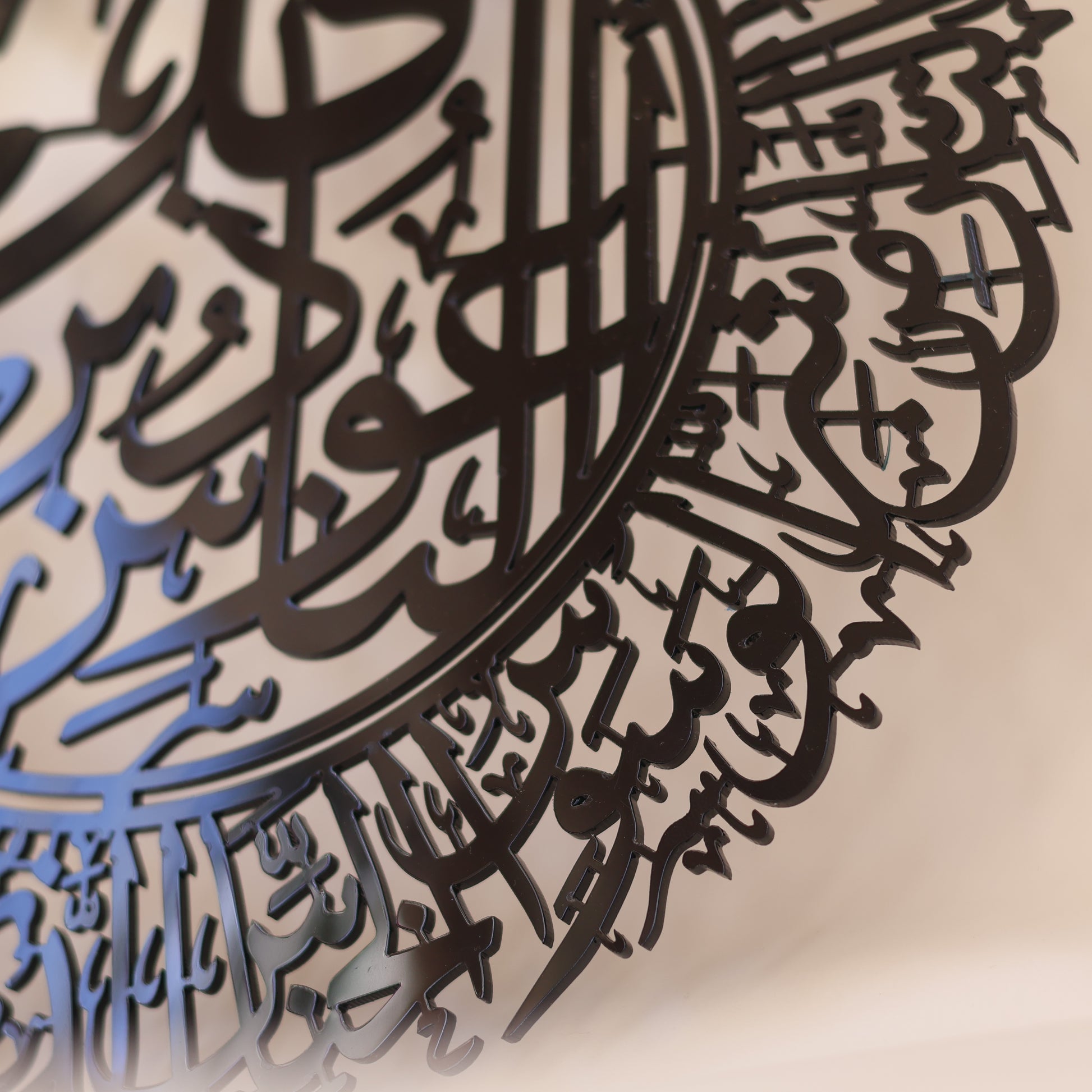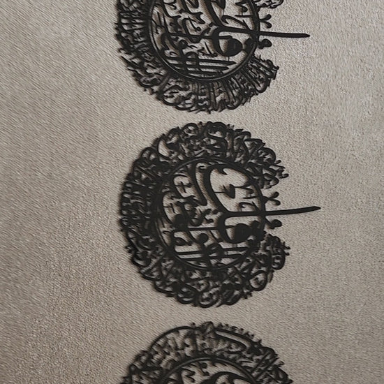 A sacred triad etched in elegance, this black wall art brings together the three powerful Qul surahs: Sūrat al-Ikhlāṣ, Sūrat al-Falaq, and Sūrat al-Nās. Each verse, a shield of divine refuge, is rendered in circular calligraphy that mirrors the eternal nature of the words themselves—unbroken, infinite, and encompassing.