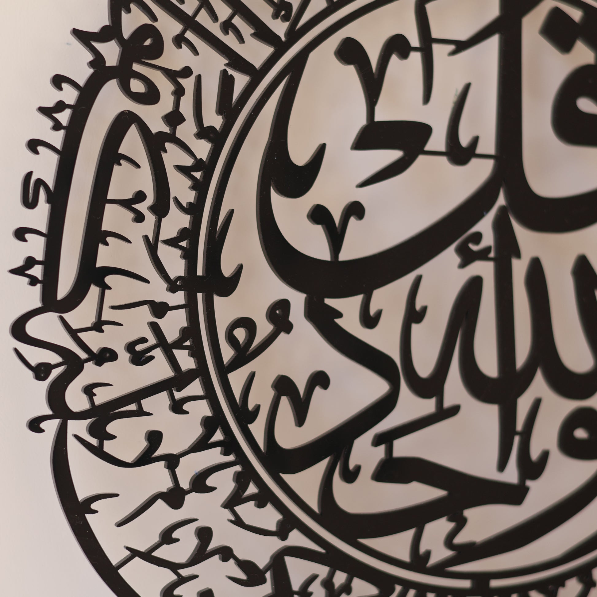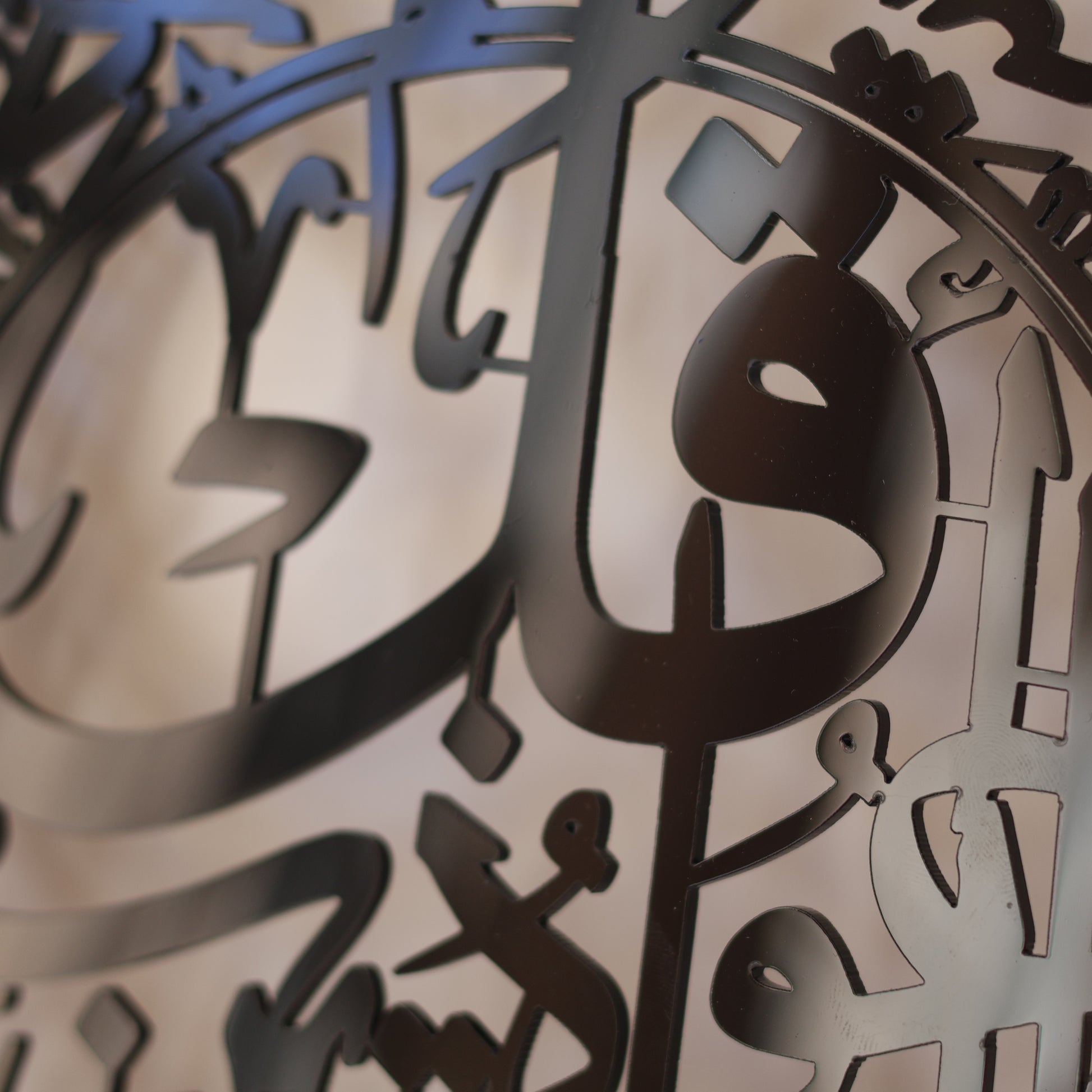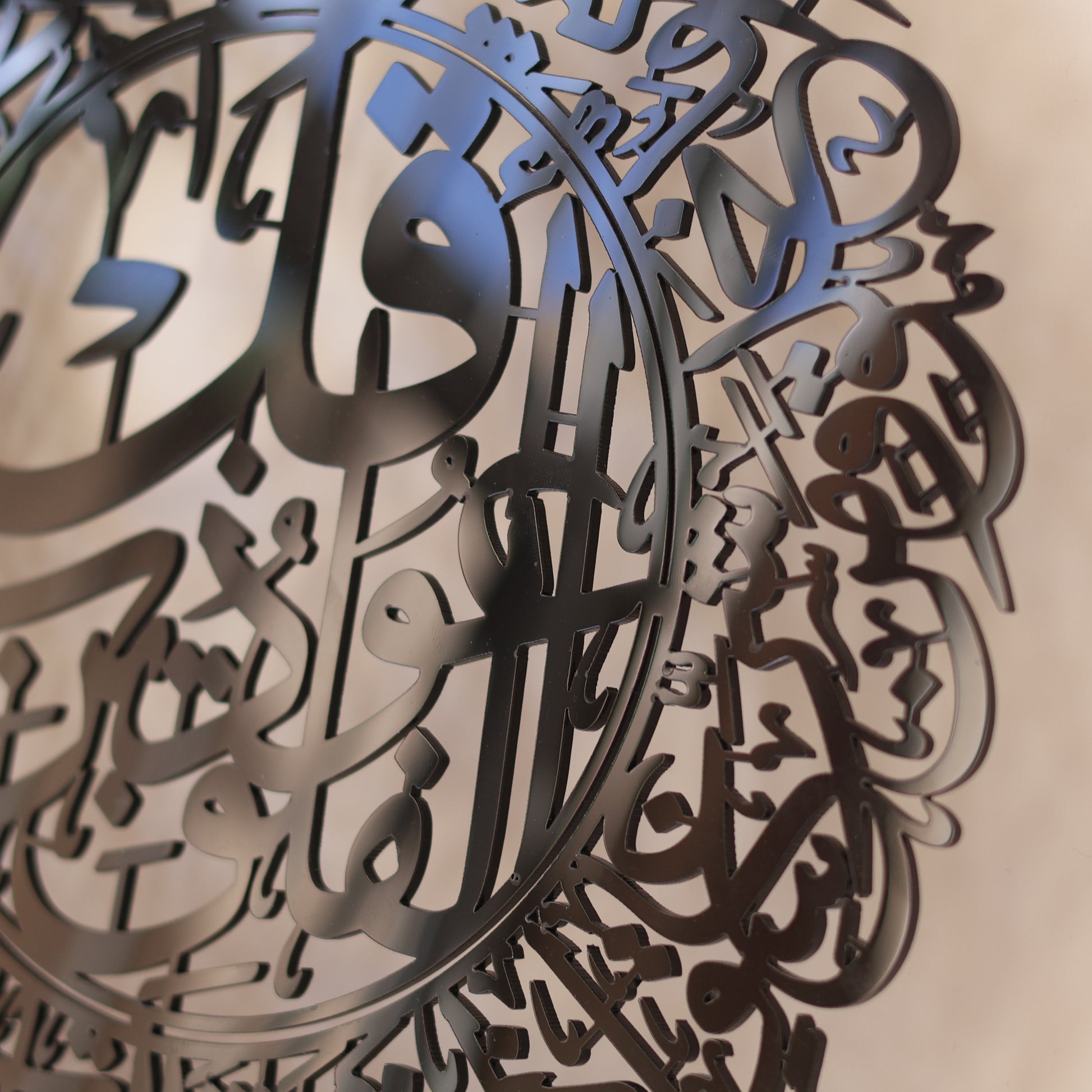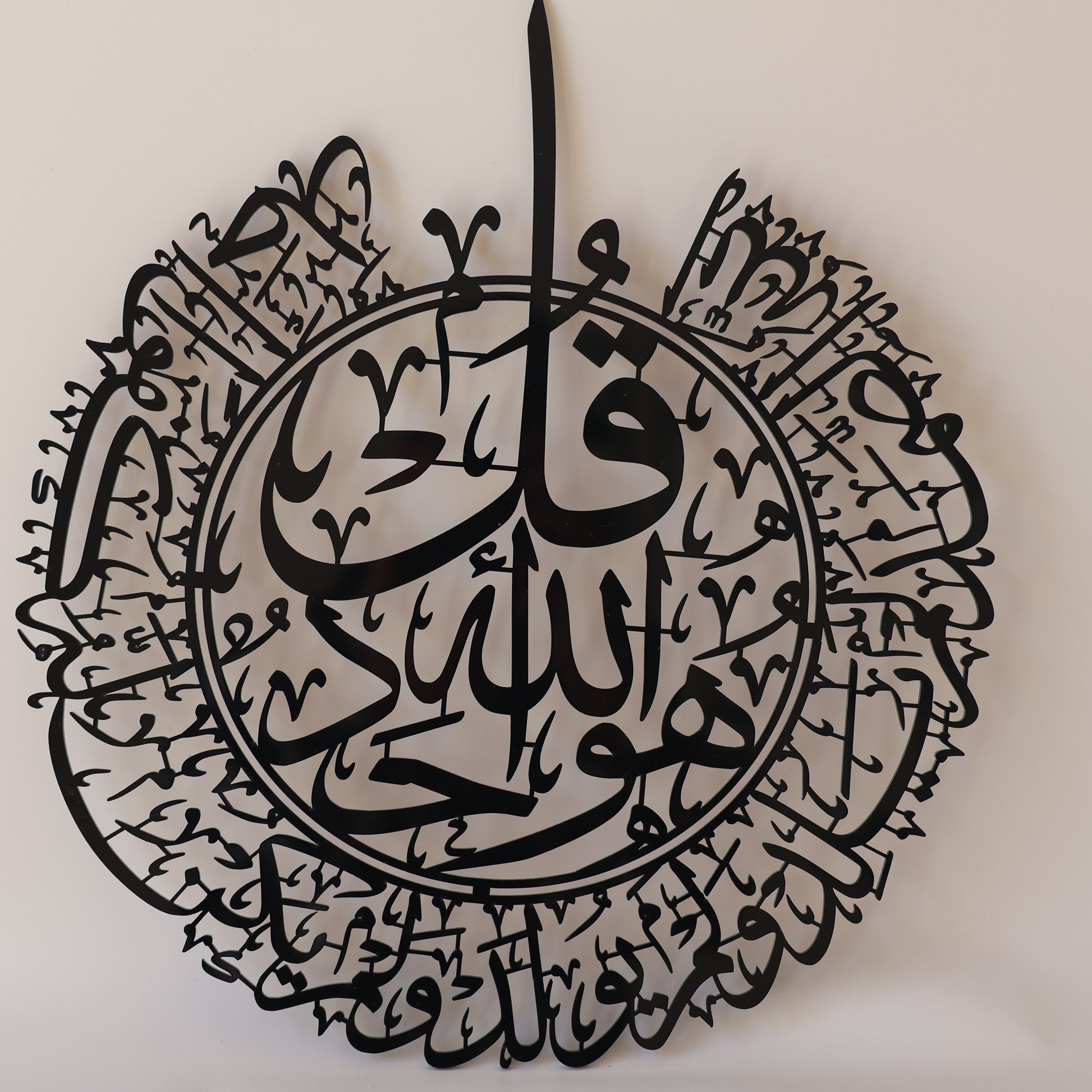 A sacred triad etched in elegance, this black wall art brings together the three powerful Qul surahs: Sūrat al-Ikhlāṣ, Sūrat al-Falaq, and Sūrat al-Nās. Each verse, a shield of divine refuge, is rendered in circular calligraphy that mirrors the eternal nature of the words themselves—unbroken, infinite, and encompassing.